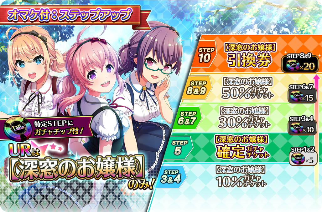 | STEP9 | ガチャチップ×20+【深窓のお嬢様】50%ガチャチケット×1 |