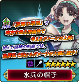 【水兵の衣装(保護)】 魔力が大幅に上昇し、闇属性で与えるダメージが大幅に上昇する 【大海の加護(勝利)】 味方全員のガード率が上昇し、更に晶石出現率も大幅に上昇する 【深海の暗黒(成長)】 味方全員の闇属性で与えるダメージが上昇し、闘神の戦庭でのみ、聖属性で受けるダメージが大幅に減少する |