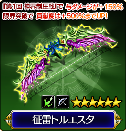 今回の目玉武器は、「第1回 神界制圧戦」の敵に与えるダメージと貢献度にボーナスが付与されます。また、『★6(弓) 征雷トルエスタ』はLv.40、『★5(杖) 闇杖シェムノーラ』はLv.30で出現し、即戦力として活躍します!