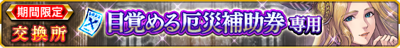 「目覚める厄災補助券専用交換所」は、「目覚める厄災戦補助券」15枚でアーティファクト『★6 黒乙女の装備品』『★6 装剣エコルデペ』『★6 偽神核』『★6 名剣アルタミラ』『★6 傭兵の佩剣(AF)』『★6 業深き眼華』、1枚で『名もなき英雄の記憶Ⅴ』と交換できる交換所です。