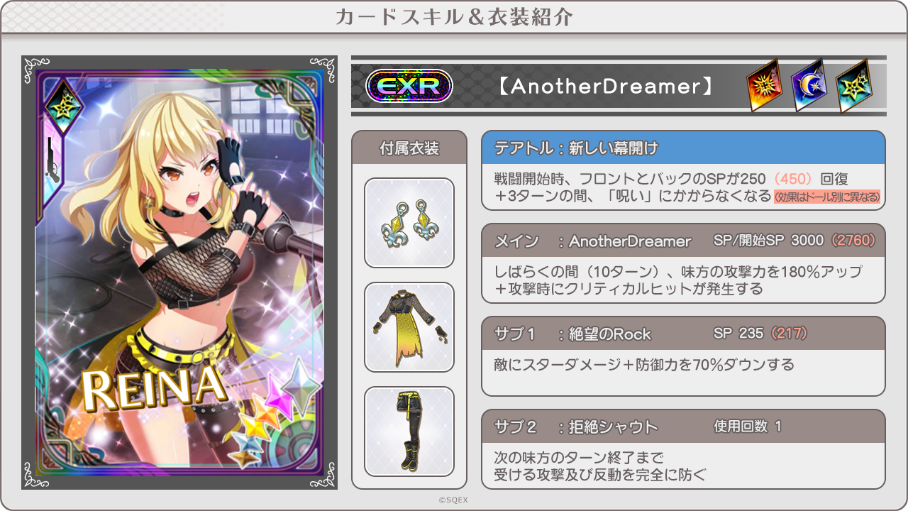 | レイナ | 絶望のRock | 敵にスターダメージ+防御力を70%ダウンする | |