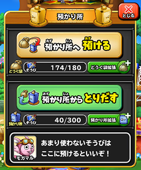 ももん屋の「預かり所」へ「どうぐ袋」に入っているそうびやスキルを預けることができるようになります。