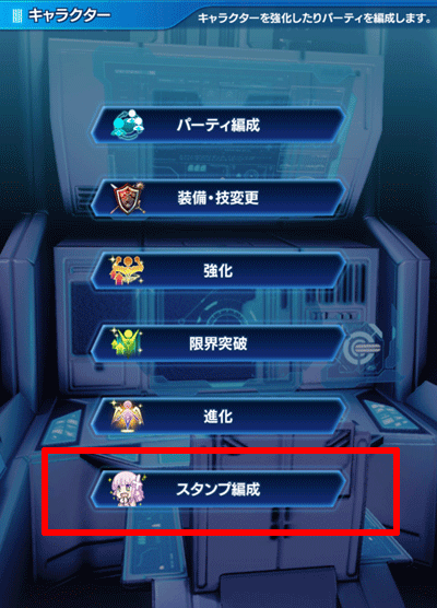 「スタンプ編成」は、「キャラクター」メニューの一番下にあります。