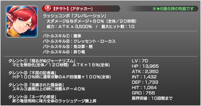 「チサト」は、すばやくラッシュコンボを発動できるナックル装備のアタッカーです。パーティ全体のラッシュゲージを微上昇させることができるため、ラッシュコンボを発動するまでの時間が短くなり、さらに自身のラッシュコンボ後の与ダメージアップは強力です。またマヒを一定時間無効化できます。