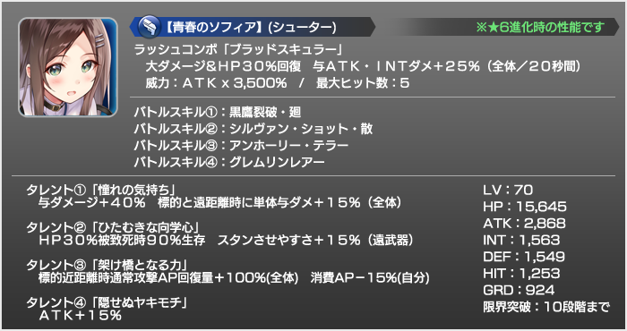 「青春のソフィア」は、距離によりバフ効果が変わるシューターです。遠距離ではパーティ全体のダメージを強化し、また遠距離武器装備者を敵の強力な一撃から守ることもできます。近距離ではパーティ全体のAP回復量をアップさせ、攻撃の回転速度が上昇します。