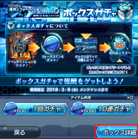 ・前回の『連邦とクォークの正義』開催時のボックスガチャの状態を引き継いでいるため、前回取得済みのアイテムは入手できません(ボックス2は何度でも入手できます)。