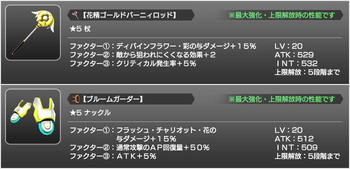 『花精ゴールドバーニィロッド』と『ブルームガーダー』を上限解放させるためには、手向けの花畑ボックスガチャなどから入手できる『ブロッサムH黄:上限解放素材』が必要となります。