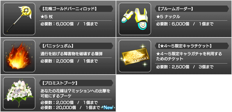 ※ブライトブロッサム【黄】交換所の交換可能回数はリセットされておりませんので、すでに交換済みのアイテムを再度交換することはできません。