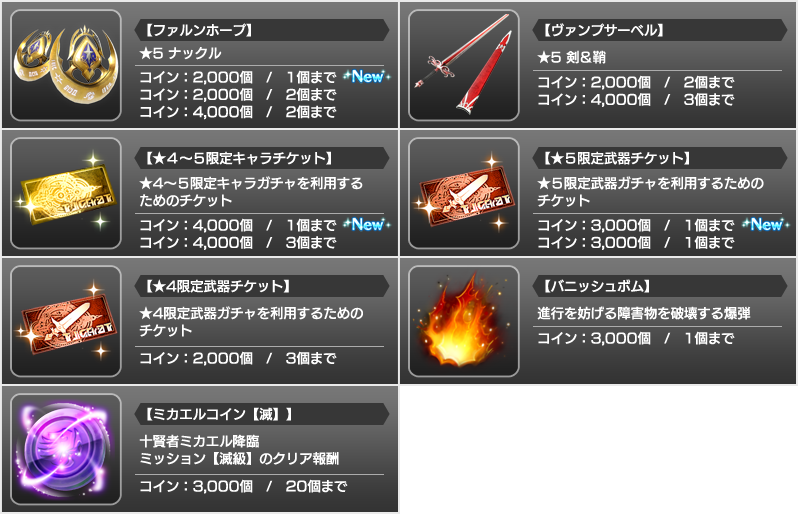 ・『ミカエルコイン』および『ミカエルコイン【滅】』で交換できるアイテムの交換可能数は、それぞれアイテムごとによって異なります。