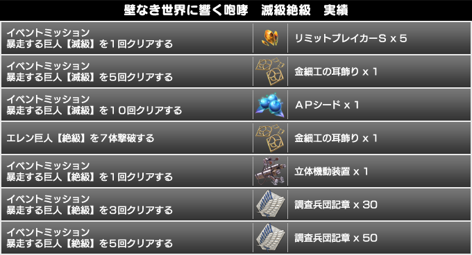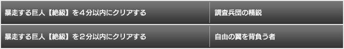 『滅級』:『訓練兵団記章』と『調査兵団記章』がドロップします。