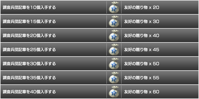 『調査兵団記章』を集めることで、『調査兵団記章交換所』から珍しいアイテムを入手できます。