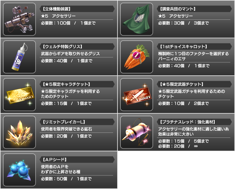 ・『調査兵団記章』で交換できるアイテムの交換可能数は、それぞれアイテムによって異なります。