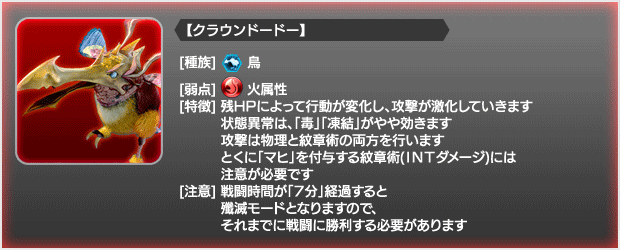 クラウンドードーは「火属性」が弱点のため、火属性のバトルスキル(紋章術)や、火属性を付与する武器を装備した状態の与ダメージが大幅にアップします。