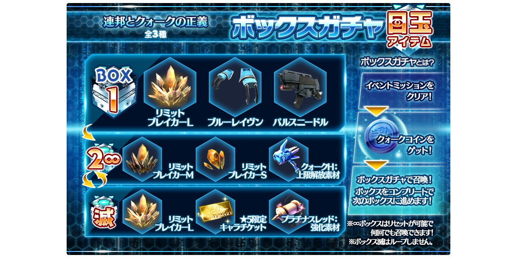 ※前回の『連邦とクォークの正義』開催時のボックスガチャの状態を引き継いでいるため、前回取得済みのアイテムは入手できません(ボックス2は何度でも入手できます)。