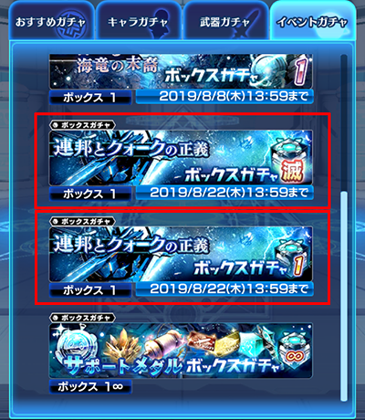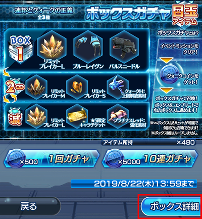 ・『連邦とクォークの正義ボックスガチャ』は、2019/8/22(木)13:59までご利用が可能です。