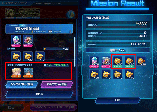 マルチプレイの場合、上記キャラクターを所持しているプレイヤーのみボーナスが発生します。