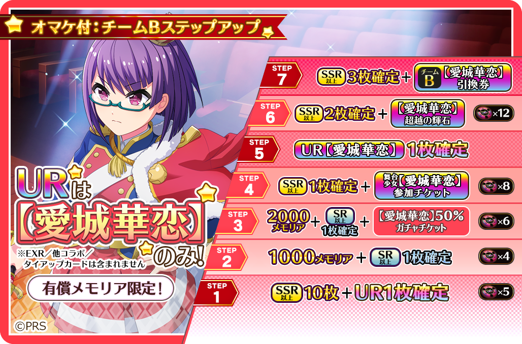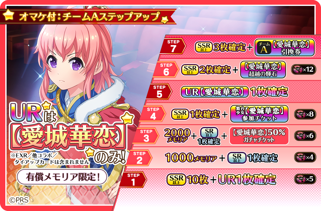| STEP7 | SSR以上3枚 | - | チーム別【愛城華恋】引換券×1 |