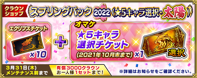 ●スプリングパック2022(★5キャラ選択・太陽)の内容 ※有償クラウン限定