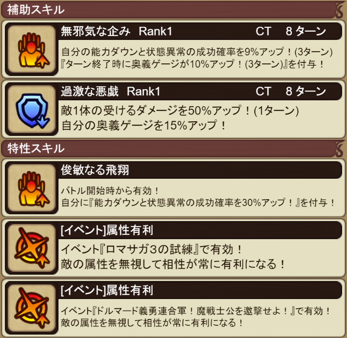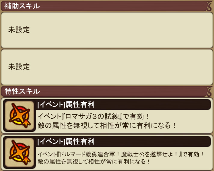 特性スキルの[イベント]属性有利、[イベント]奥義ゲージ100%アップ、
