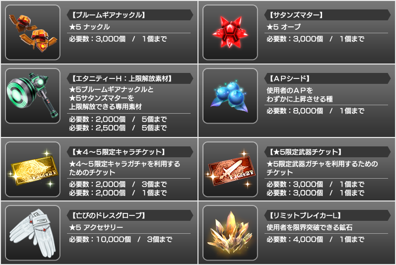 ・『エタニティーコイン』および『エタニティーコイン【滅】』で交換できるアイテムの交換可能数は、それぞれアイテムによって異なります。