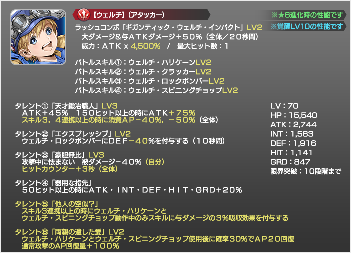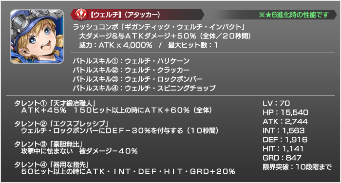 ・【ウェルチ】(アタッカー):与ATKダメージ+50%(全体/20秒間)