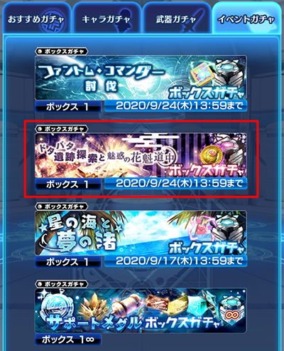 『ドタバタ遺跡探索と魅惑の花魁道中ボックスガチャ』は、2020/9/24(木)メンテナンスまでご利用が可能です。