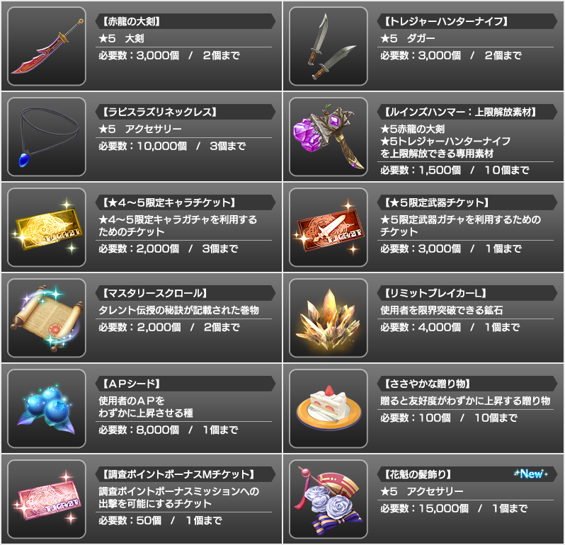 『黄金のコイン』で交換できる一部の品をご紹介します。