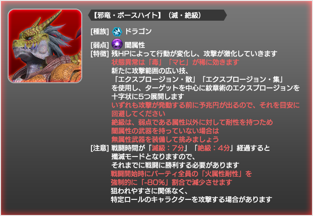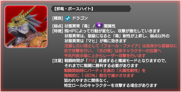 邪竜・ボースハイトは「闇属性」が弱点になるため、「闇属性」のバトルスキル(紋章術)や、「闇属性」を付与する武器を装備した状態の与ダメージが大幅にアップします。