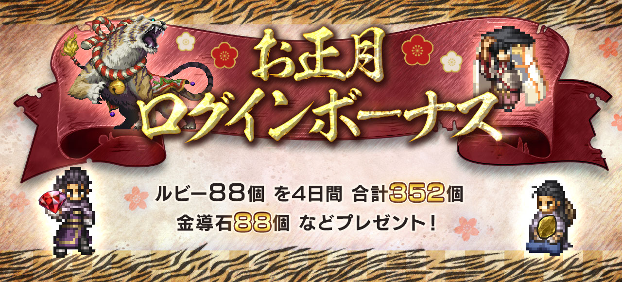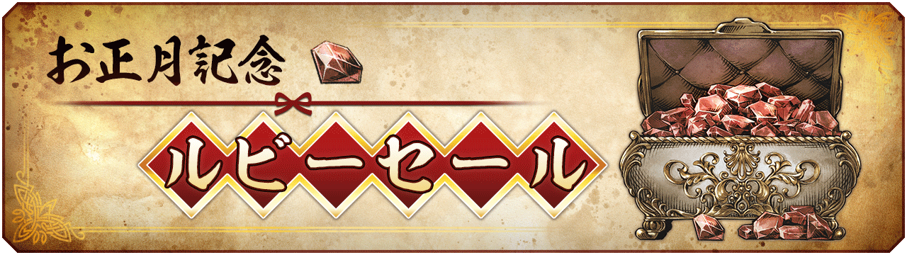 ・「お正月記念 特別ボーナス付ルビー」の詳細につきましては「メニュー」>「ショップ」>「ルビー購入」からご確認ください。