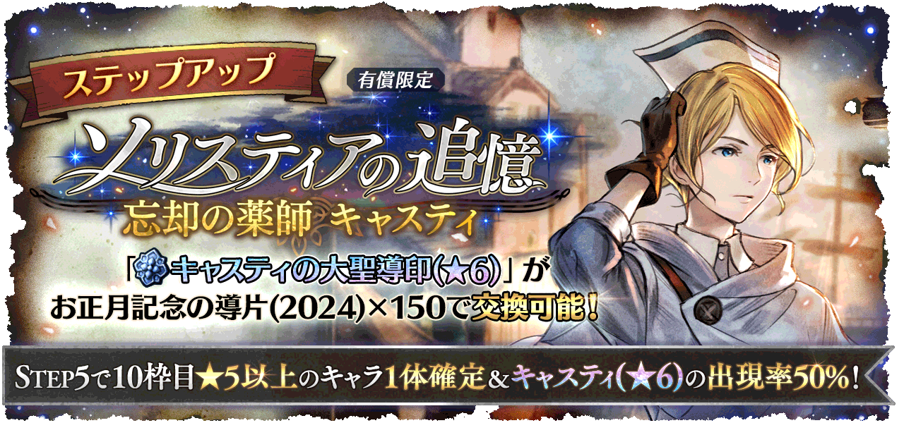 ・“キャスティ”は「巡り会う旅人たち」、「導かれし旅人たち」、および同時期に開催している「ソリスティアの追憶 ヒカリ」「お正月記念 ステップアップ ソリスティアの追憶 流浪の剣士 ヒカリ」「ステップアップ 迎春の導き」「お正月記念 天運の導き」「年始記念 日めくり導き」を含む他の導きからは出現しません。