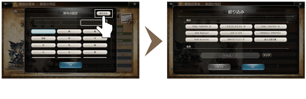 救世の写本>旅団の写記の称号設定のダイアログにて、絞り込み機能を追加しました。